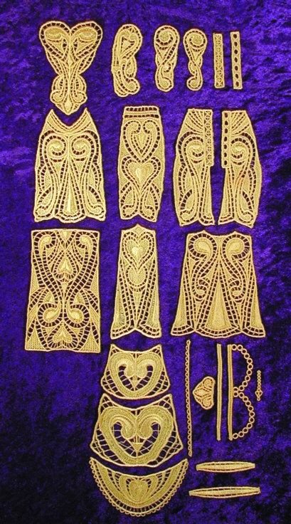 Two sizes and several variations allow you to create a number of different looks with the designs in this package. Using 60-wt rayon, create dresses in five different lengths, with sleeves or with straps, to fit 11-12" and 15-16" fashion dolls such as Tyler Wentworth, shown here. Files are included for the tiara and earrings, and there is also a pattern for the fabric slip Tyler wears. Additionally, bodice parts in dst and pes formats are combined in one file for large hoops. To see the individual files, click here. For matching accessories, miniature designs for a doll Christmas tree, including a three-dimensional lace angel, and small edgings suitable for dolls or babies, take a look at the Mini K-Lace®: Doll Accessories & More collection. Delicate K-Lace® is available only on CD.