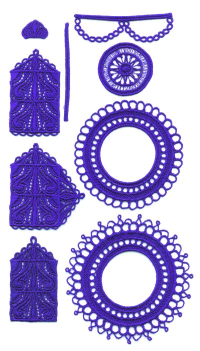 Decorate a miniature Christmas tree with these mini hanging lace ornament which can double as earrings and pendants for children or adults. The 2.5" angel tree-topper has many other uses and will hang from the branch of a larger tree as well. Tiny charms and motifs are perfectly sized for fashion doll jewelry and clothing decoration. The tiny, delicate edgings may also be used as necklaces for dolls and edgings for baby clothing and lingerie. The doll hat, stole and purse files are in two sizes, for 11-12" and 15-16" fashion dolls. The stole files will also make an elegant edging. The larger size is 2.5" wide. These accessories match the dress designs in Delicate K-LaceŽ. One version of the ornament covers fits 1" glass ornaments. Another version is suitable for attaching to decorated styrofoam balls with a pin for hanging. The delicate edgings are suitable for doll or baby clothing as well as lingerie. Please note: the hat brim for the 15-16" fashion dolls will not fit in 4" hoops. All designs in this package are stitched with 60-wt rayon thread. Click here to see the hat, dress and purse dyed with Rainbow Transfer Paper. Click here and here to see all the individual designs.