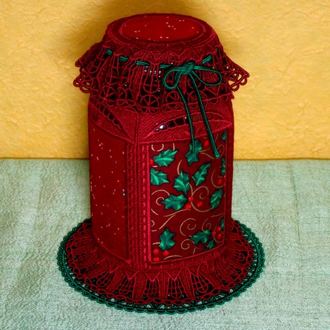 jars and includes optional bottom ruffle. Lid Cover/Doily comes in two versions, one with a center hole to fit the